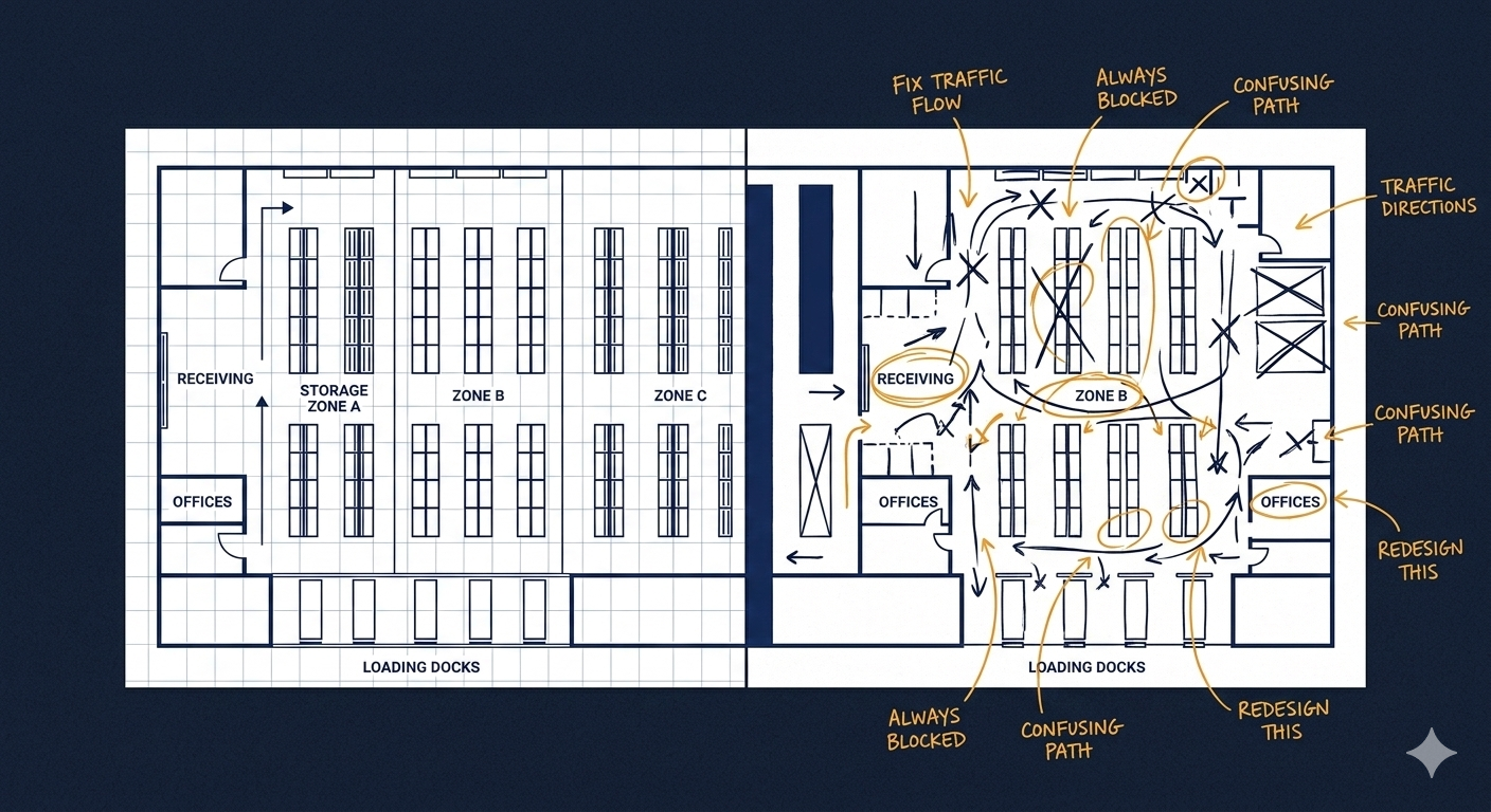It was not built from the pick route your most senior associate has optimized over nine years. The shortcut through seasonal staging that shaves four to six minutes off the east-side loop on every cycle and exists in no process document. It was not built from the line lead who has spent twelve years learning which failure modes the official process doesn’t account for and routing around them before management gets a call. It was not built from the Monday throughput pattern in aisle 14 that your team has been compensating for since year two.